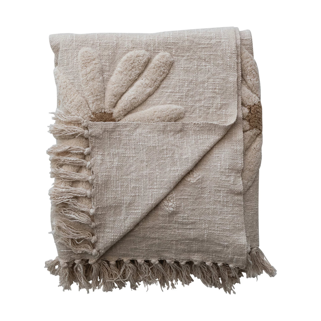 Cotton Slub Throw with Tufted Flowers & Fringe, Natural & Tan Color